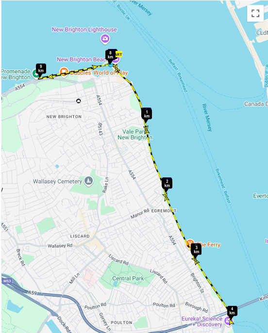 Runners begin at the historic Fort Perch Rock, New Brighton, heading south along the promenade with stunning views across the River Mersey to the Liverpool skyline. Continue along the coastal path towards Seacombe Ferry.